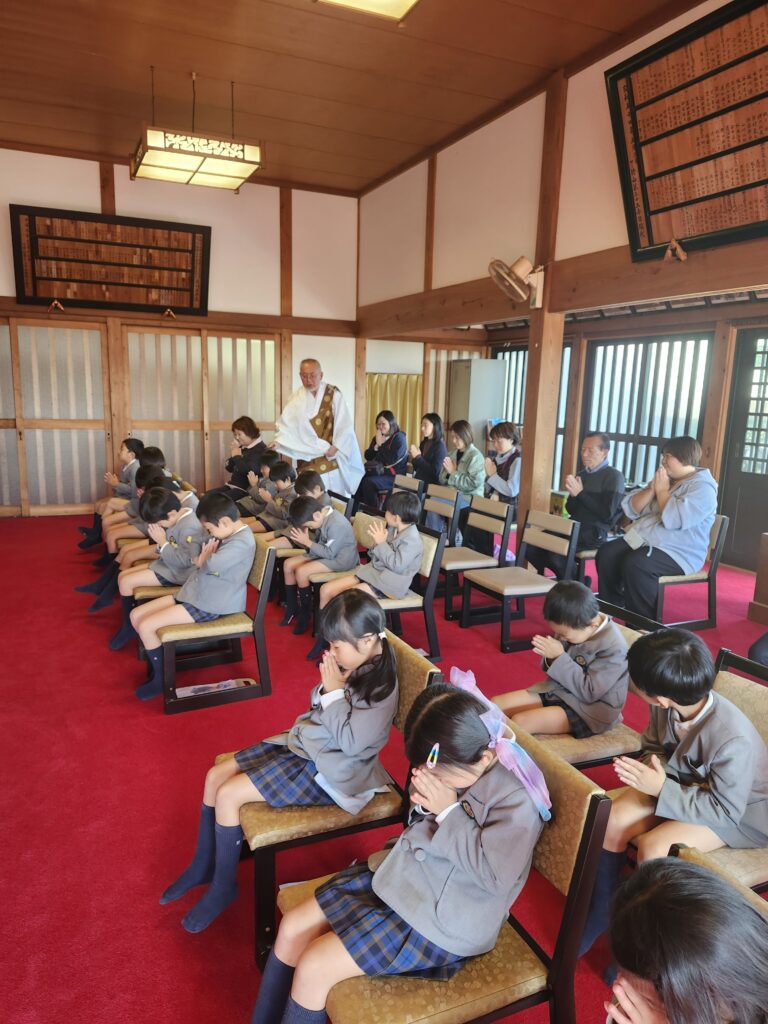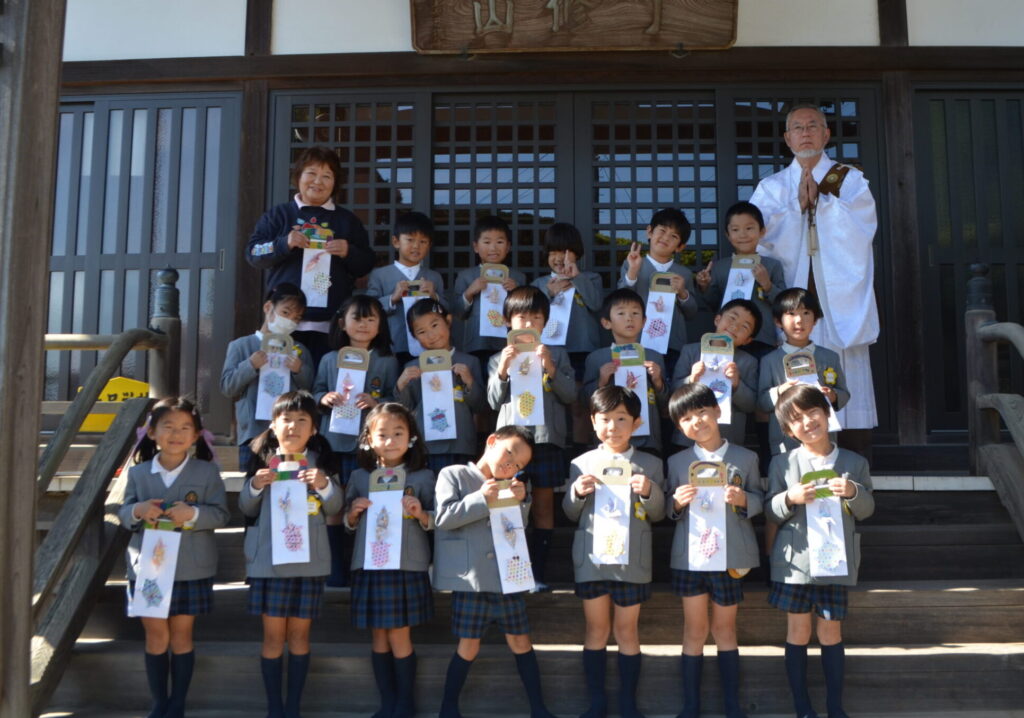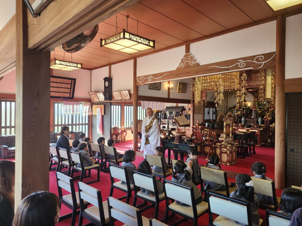 幼稚園の子ども達皆で、隣接する本源寺の本堂をお参りしながら七五三のお祝いをしました。