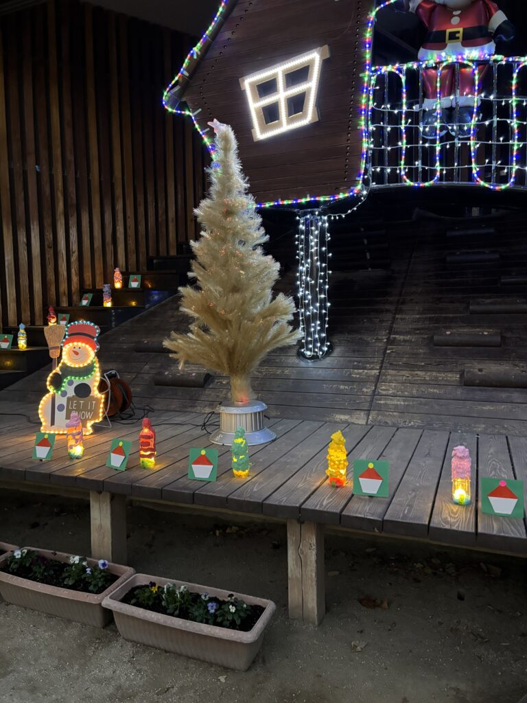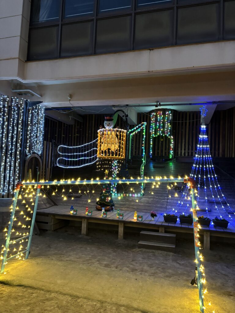 お知らせ ほんげんじイルミネーション 2025/12/19 12/17 年に一日だけですが、にこにこランドを年長組さん製作のランタンと共にイルミネーションで飾り付けをして、「ほんげんじイルミネーション」を開催しています。いつもと違う暗い幼稚園に集まり、子ども達も大はしゃぎです。