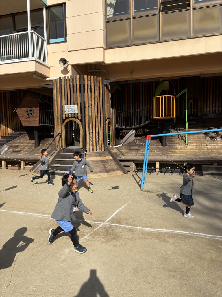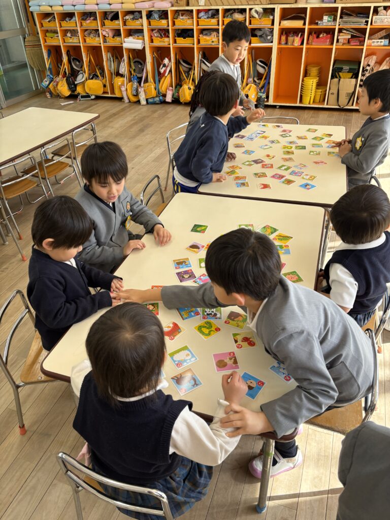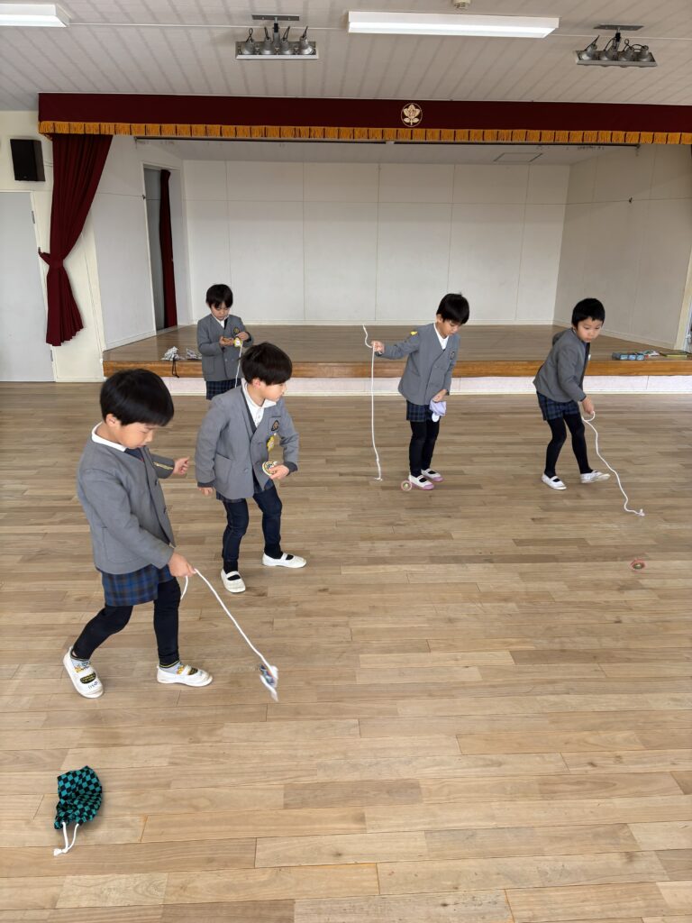 3学期が始まりました。お正月の伝承遊びの凧揚げ、コマ回し、カルタ取り。縦割り保育で、皆で協力しながら行っていきました。本年もよろしくお願い致します。