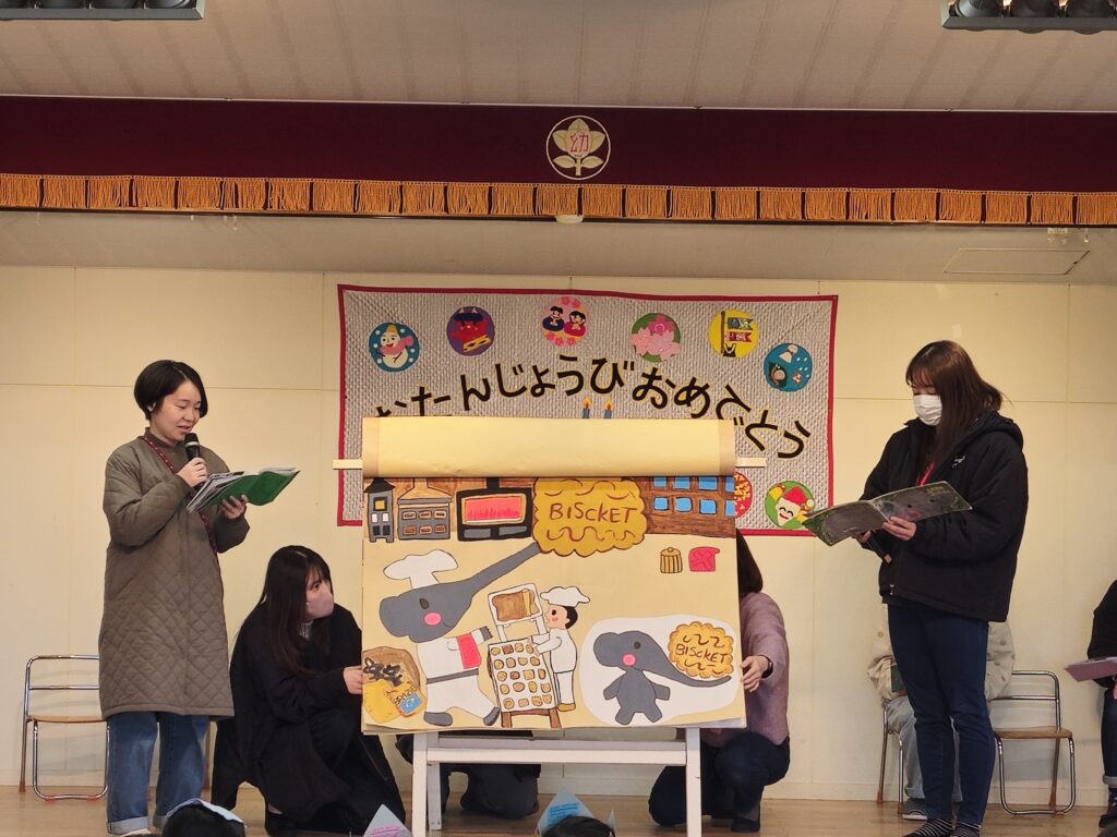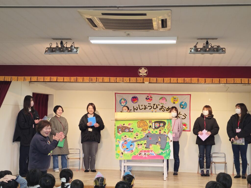 お知らせ 大型紙芝居読み聞かせ 2026/2/13 有志のお母様に、大型紙芝居作りをお手伝いして頂く企画第2段!で「ぐるんぱのようちえん」が完成し、2月のお誕生日会で発表して頂きました。子ども達もとても楽しんでいました。今後もよろしくお願い致します。ありがとうございました。